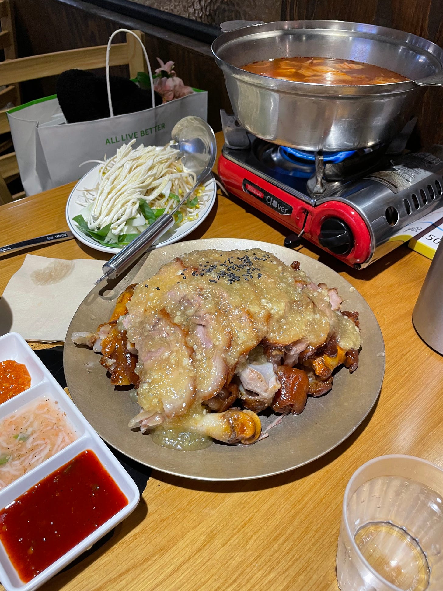 Jokbal is a combination of pork trotter, hock and shanks that have been braised in a seasoned broth for a minimum of twelve hours. This length ensures a super tender meat, complimented with a good extraction of keratin and collagen from the bone. Topped with fermented garlic, accompanied with seasoned poaching liquid and paired with eleven different banchan. I love to eat medicine bro.